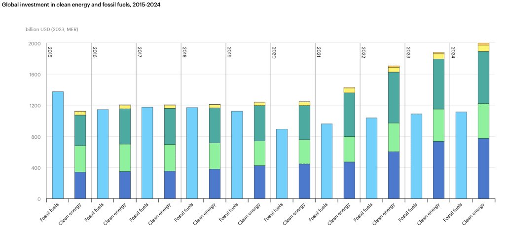In their latest World Energy Investment report, the International Energy Agency shows investment in clean energy this year set to nearly double that in fossil fuels, which remains lower than pre-pandemic levels, despite pressures for many western economies to invest in their own fossil fuel reserves to inch closer towards energy independence.
