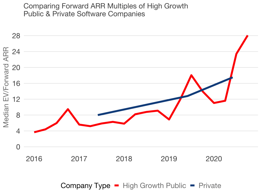 When comparing ARR multiples for private and public companies, Tunguz found that the public markets are rewarding high-growth companies with a valuation premium up to 50% higher than in public markets.
